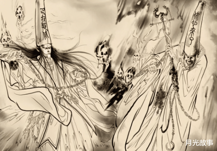 正说着,忽然刮来一阵阴风,吹得人后脊梁发冷,像是到了寒冬一样。只见两个穿黑袍的差役模样的汉子站在跟前,一个马脸长须,一个圆脸无须,手里都提着铁链子。